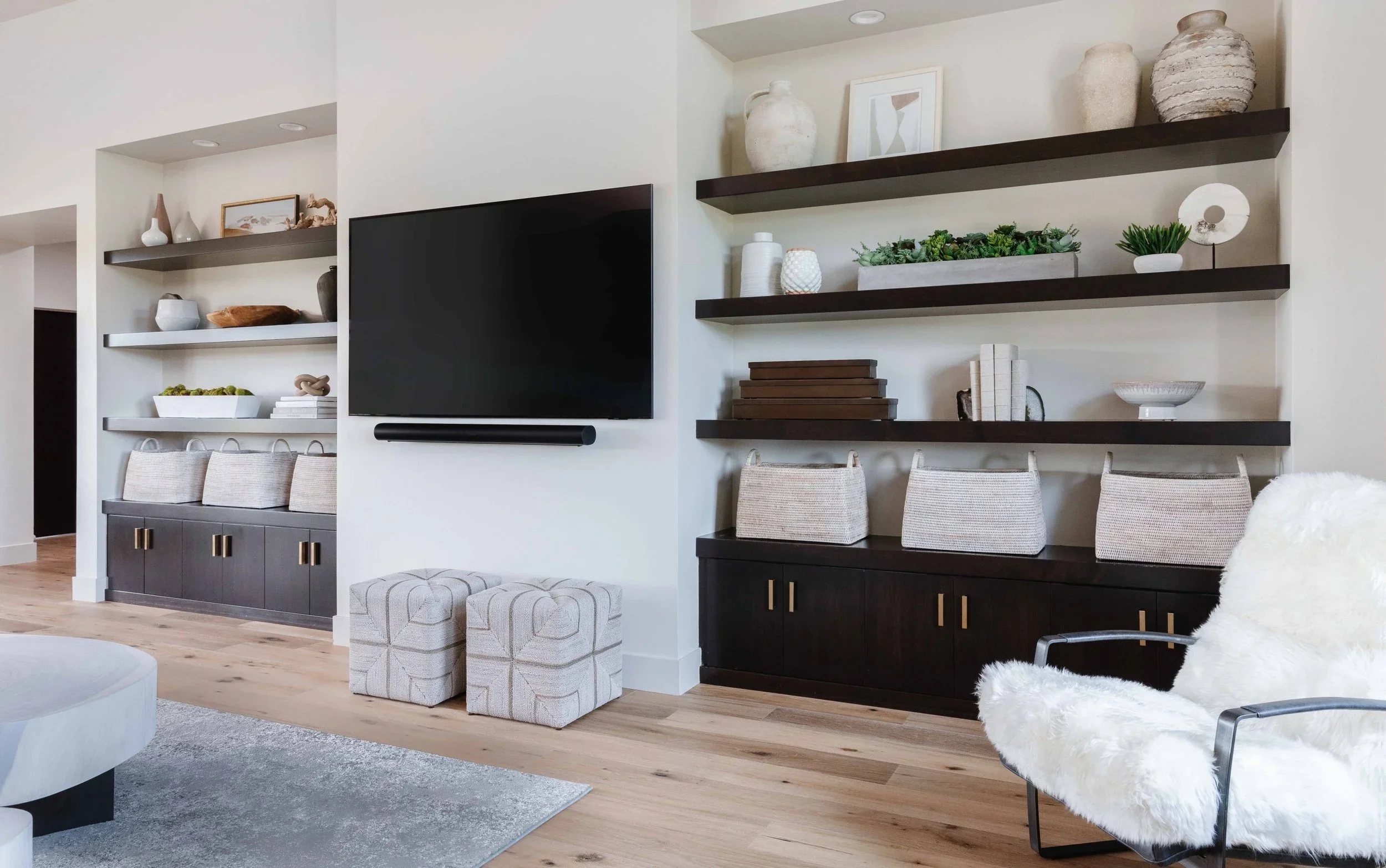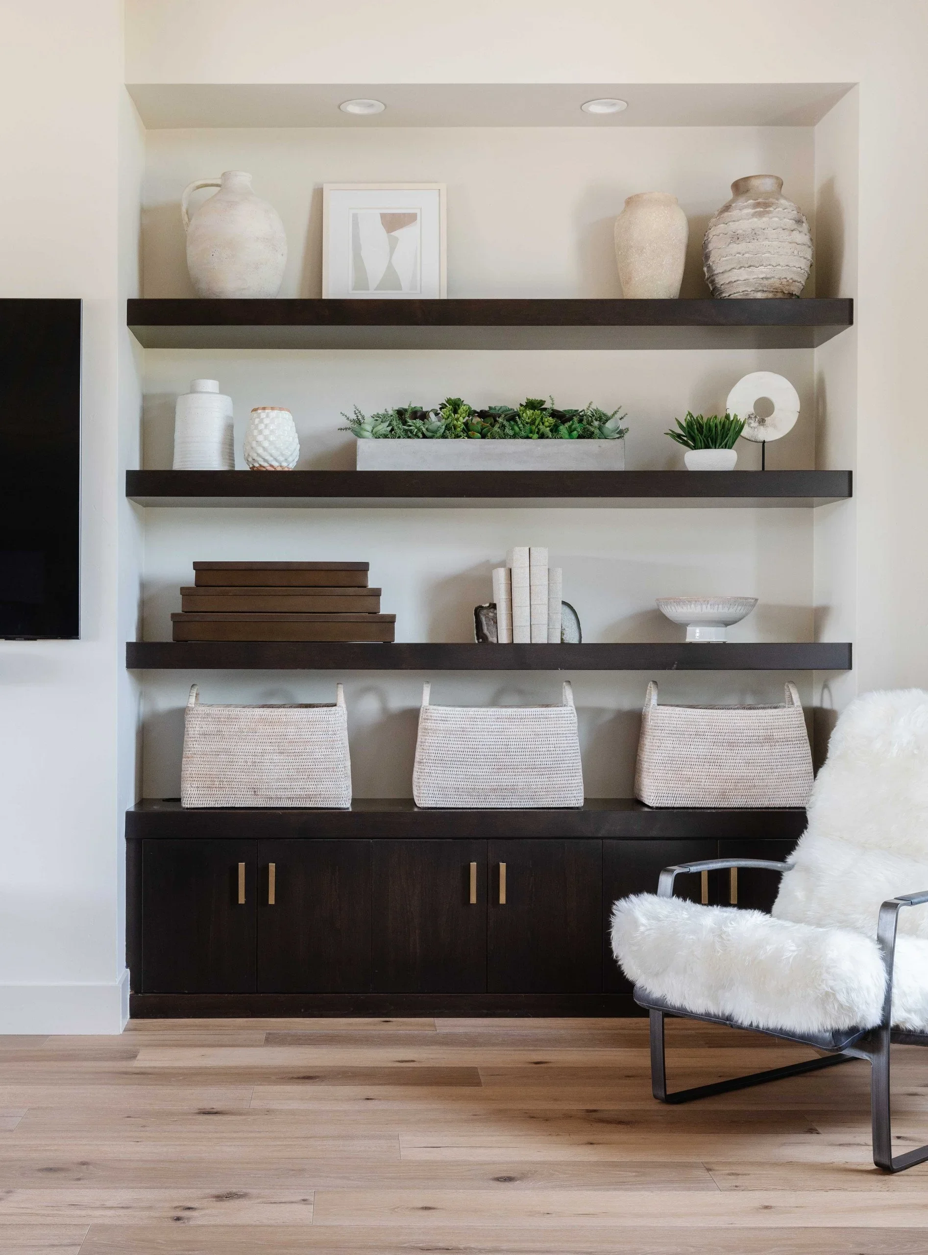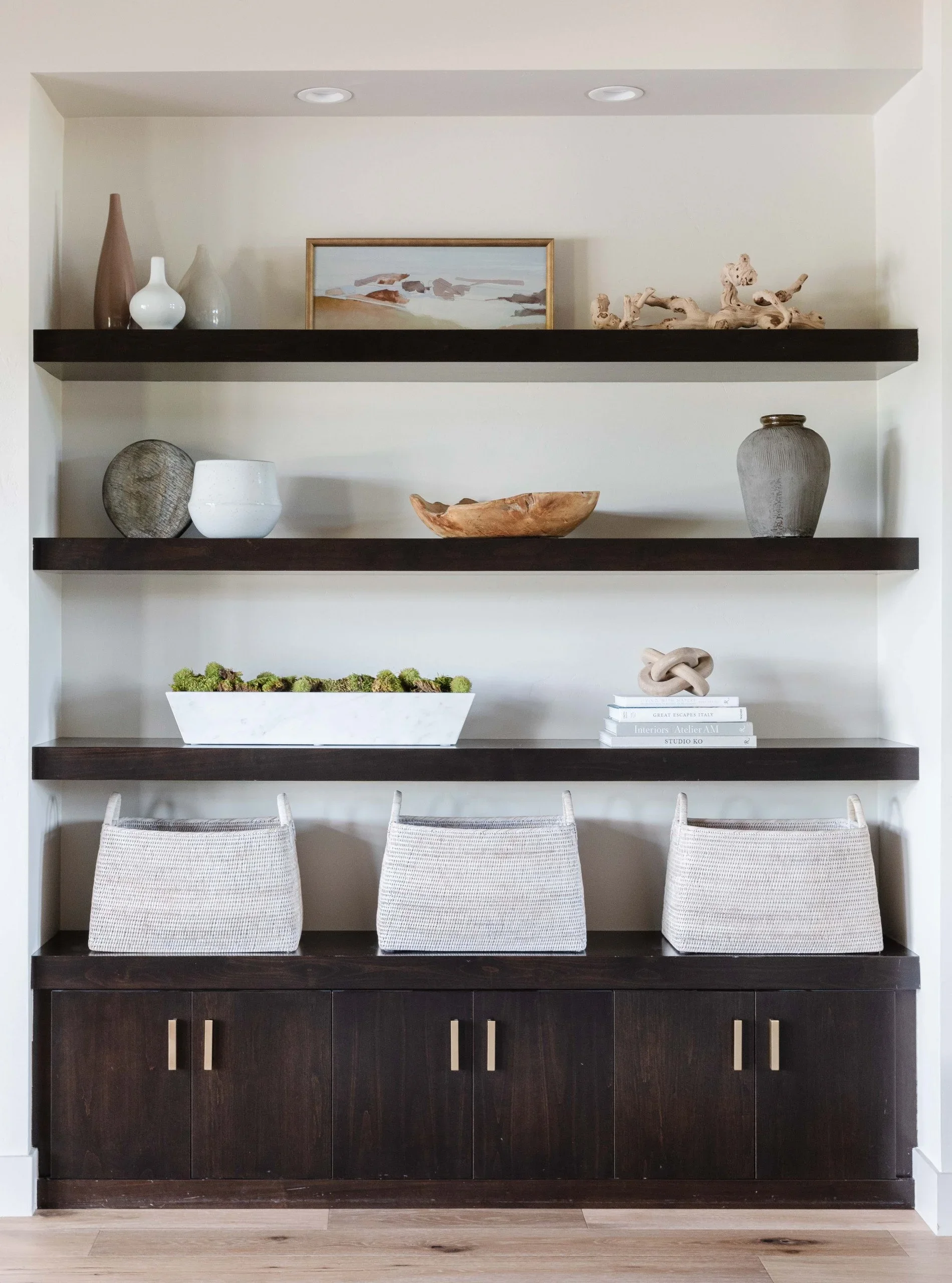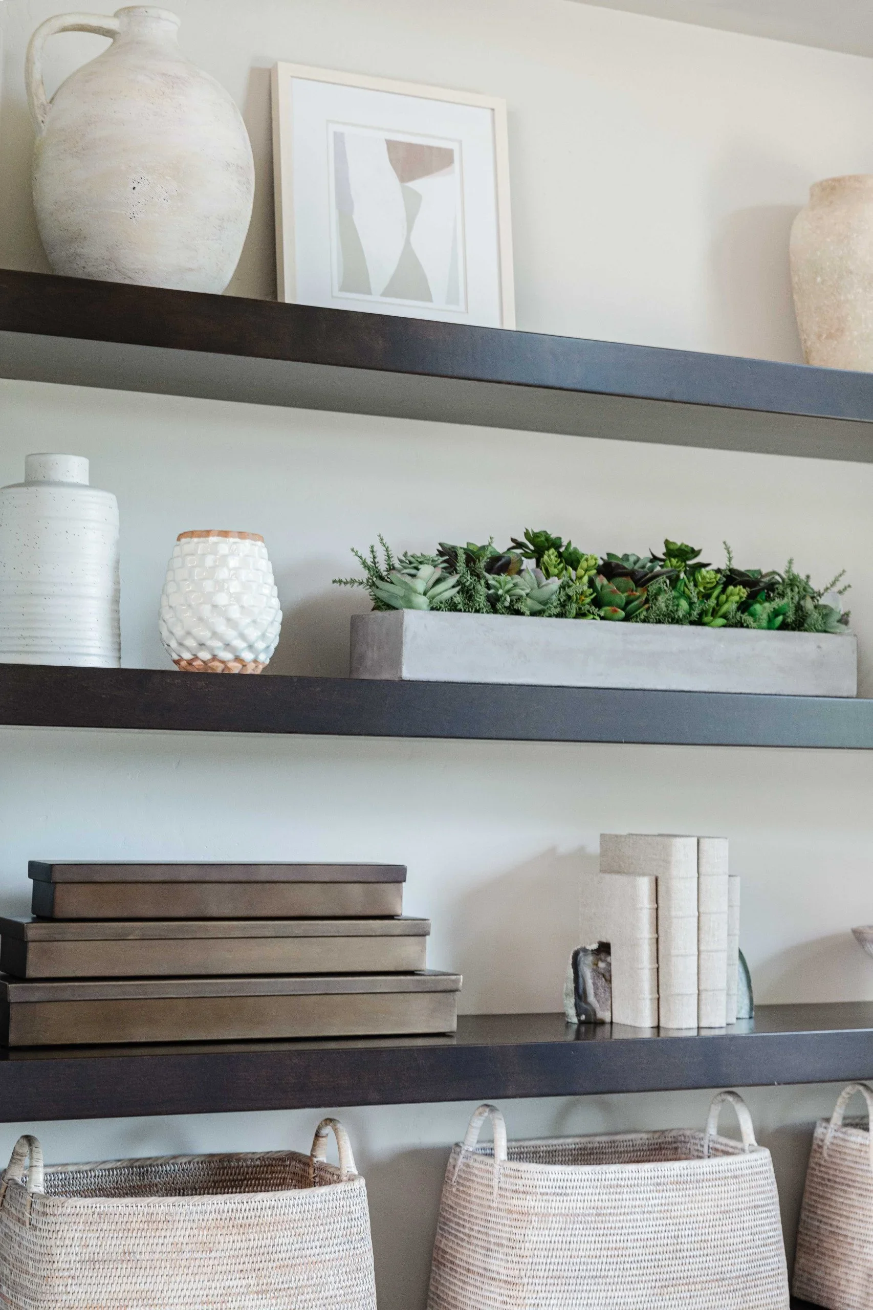 This homeowner had been caught in design paralysis. A large room with open shelving and bare walls felt unfinished, despite the beautiful backdrop she already had. We brought in carefully curated furniture pieces and styled the shelves and walls to add the finishing touches, transforming the space into the warm, organic sanctuary she had been longing for.