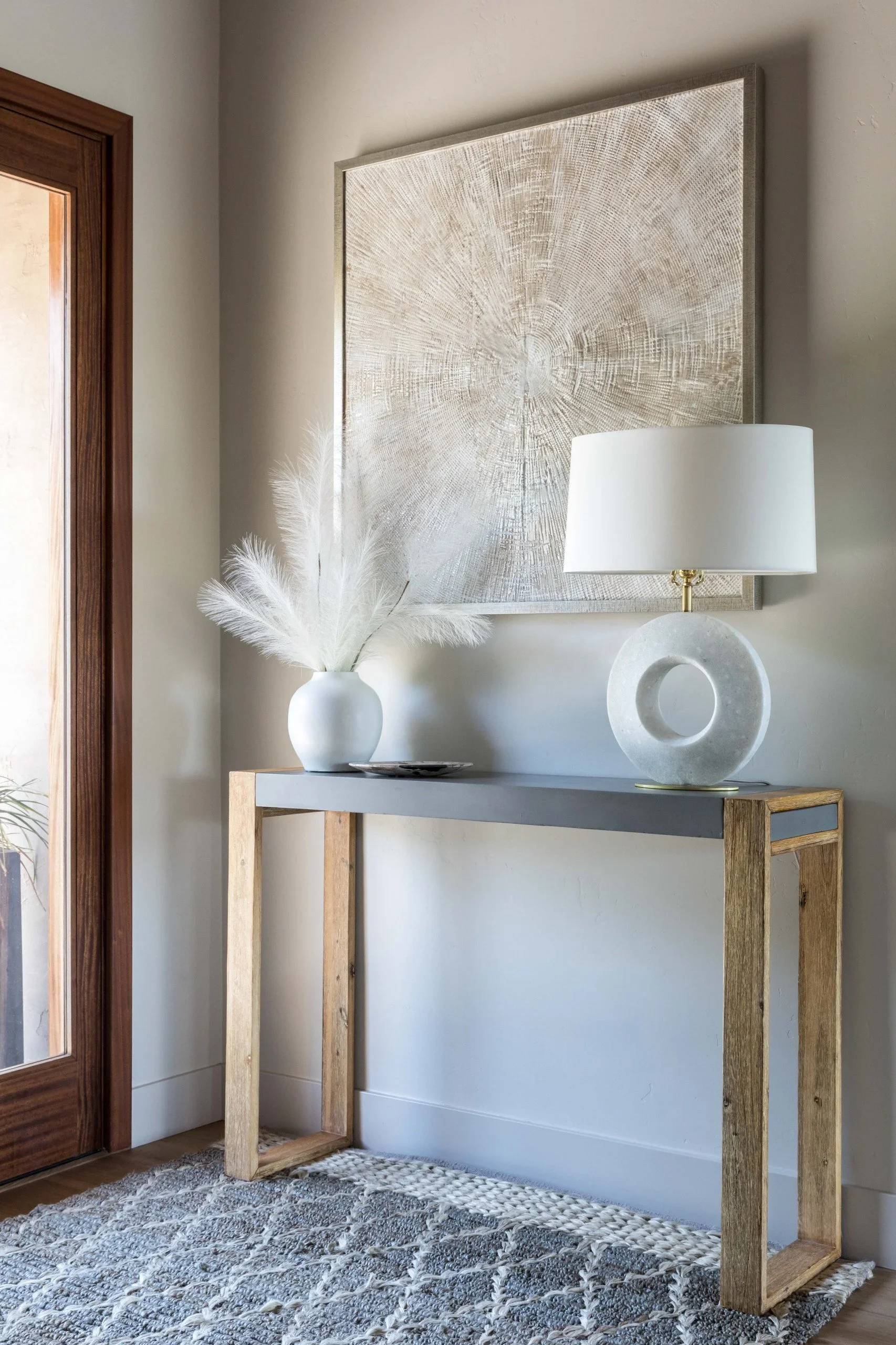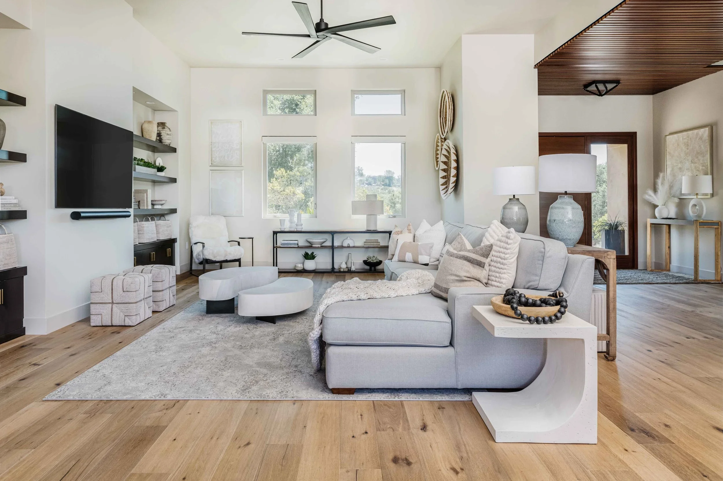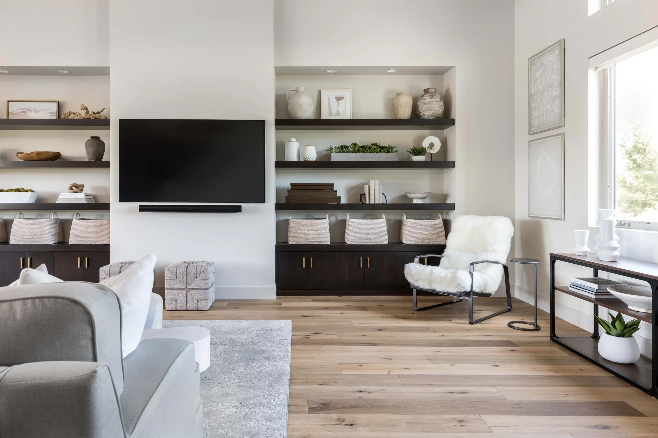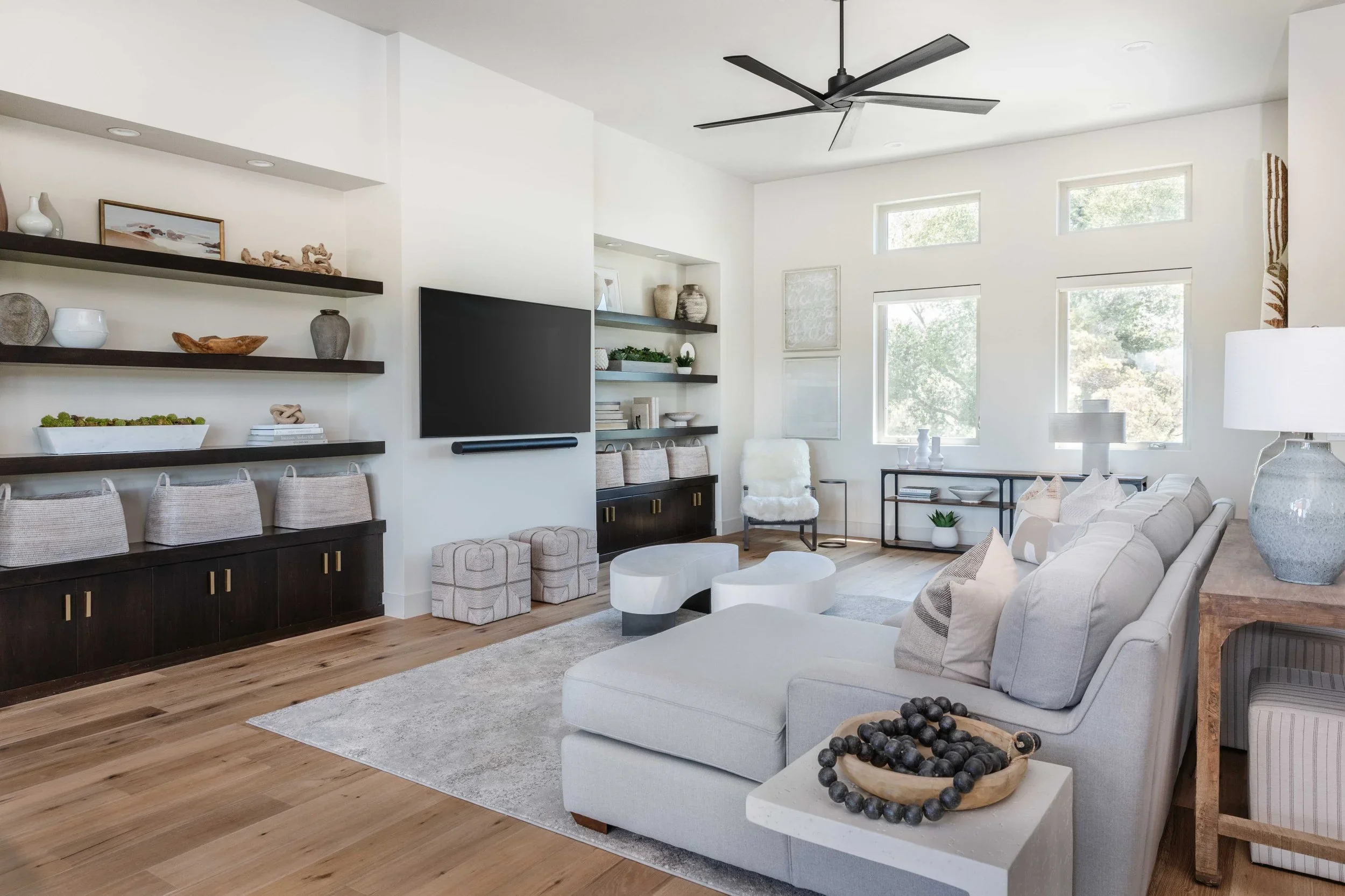 This homeowner had been caught in design paralysis. A large room with open shelving and bare walls felt unfinished, despite the beautiful backdrop she already had. We brought in carefully curated furniture pieces and styled the shelves and walls to add the finishing touches, transforming the space into the warm, organic sanctuary she had been longing for.